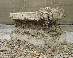 Edible Building Block materials: rammed earth (clay, sand, gravel), straw, birdseed. approx. dimensions: 18x36x24"