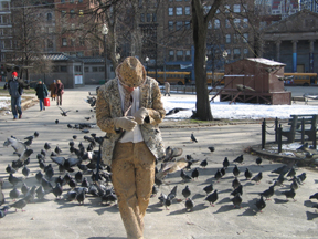 Pigeons observes Boston Common from the point of view of its avian inhabitants. The piece investigates the relationship of pigeons to the urban environment through video captured while wearing a special birdseed-covered suit. Interactions with pigeons recorded by the cameras installed on the suit and an external observer form the basis of a short video documenting the piece.